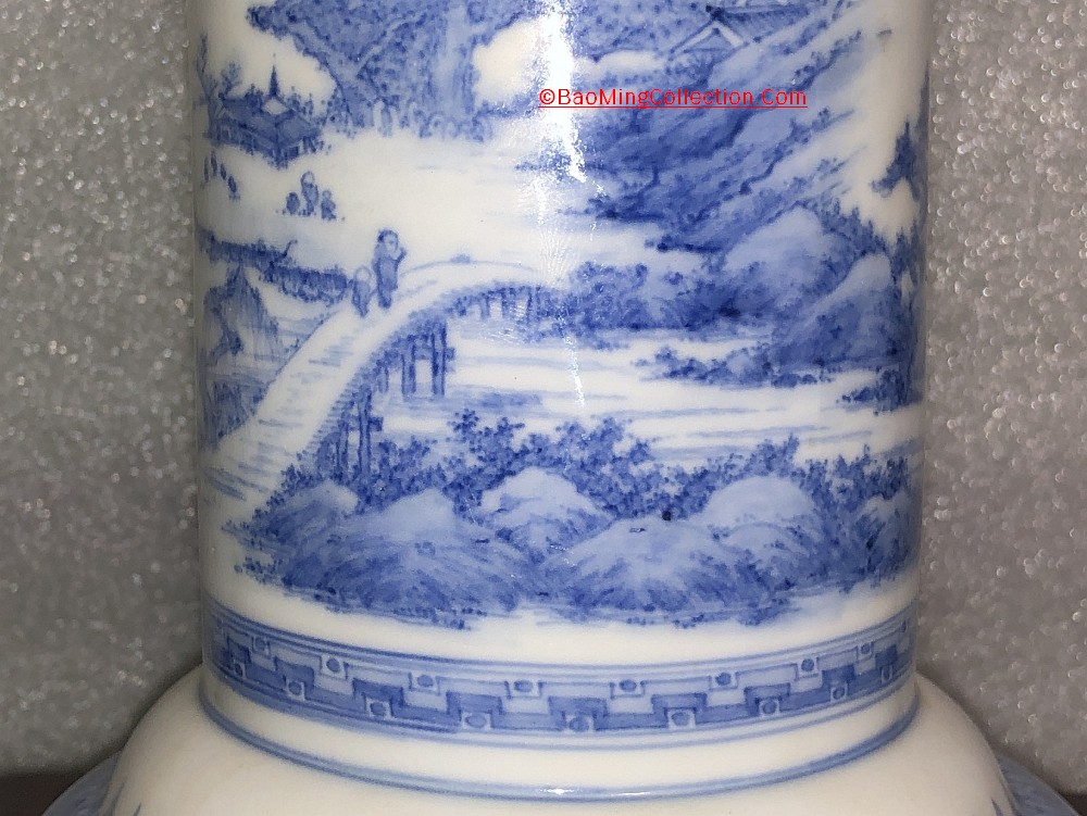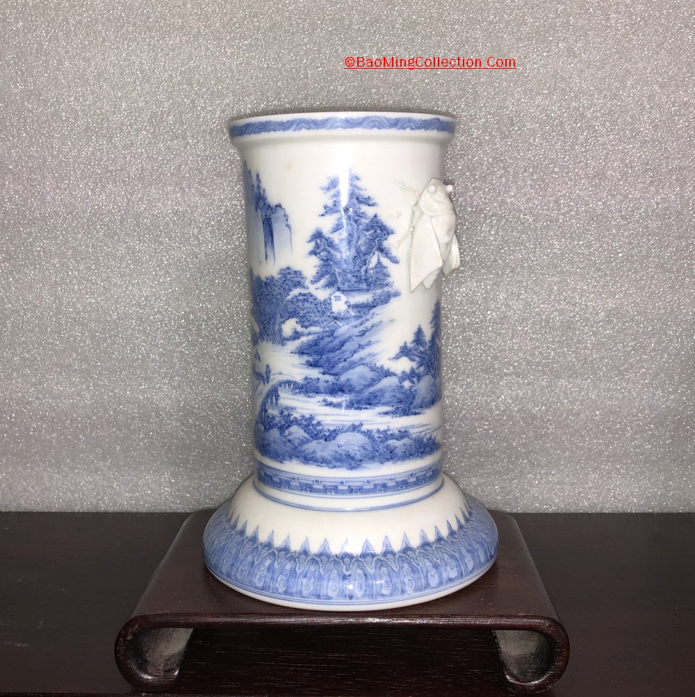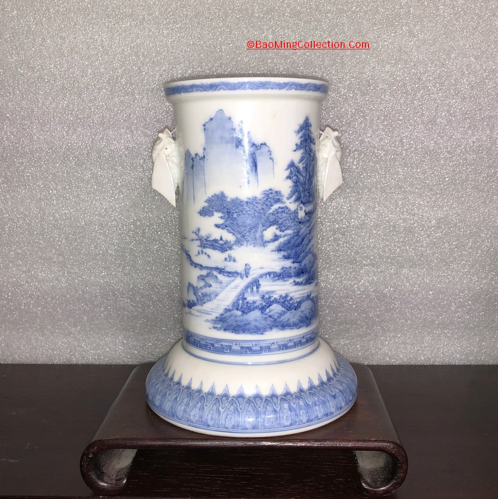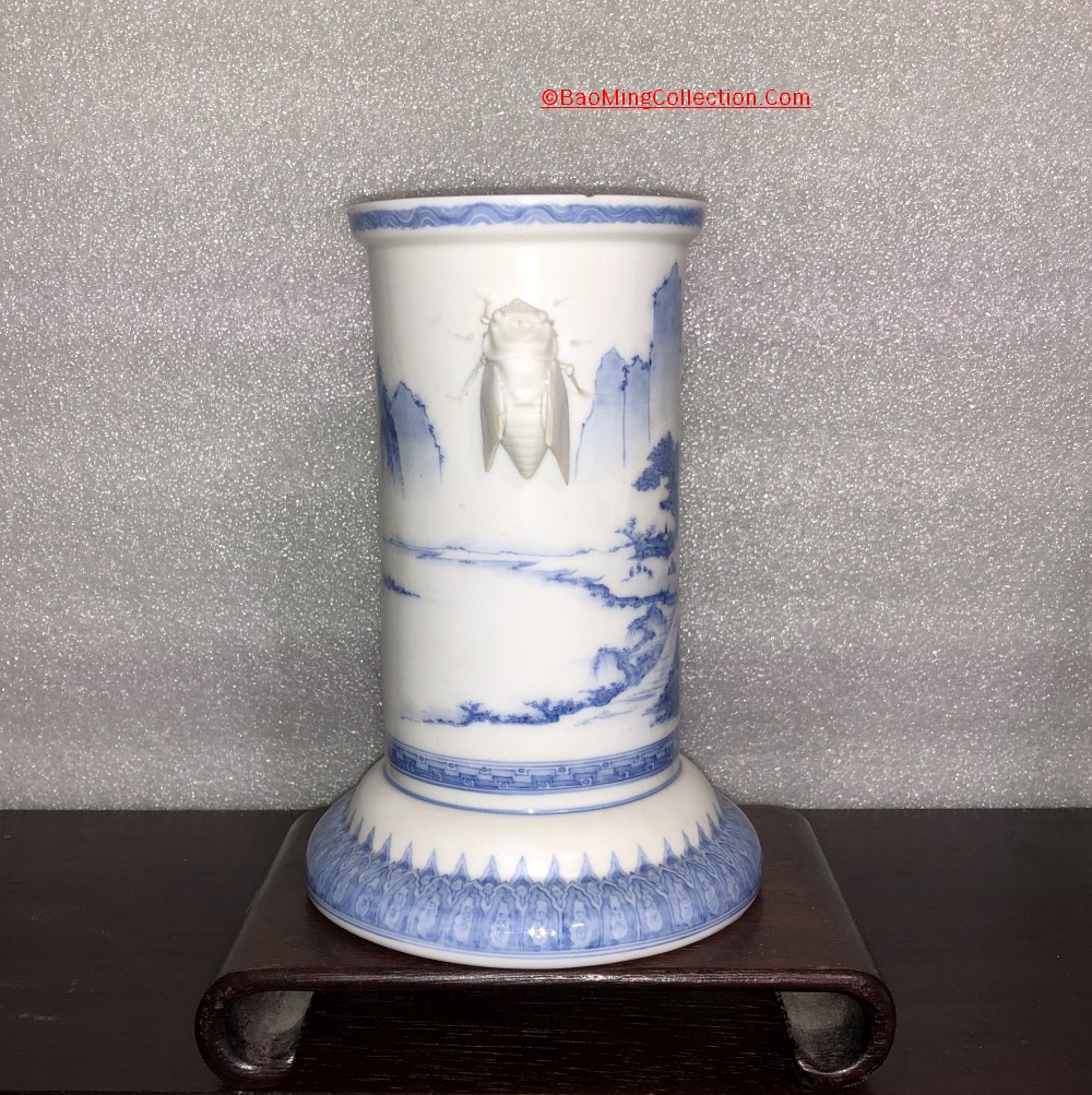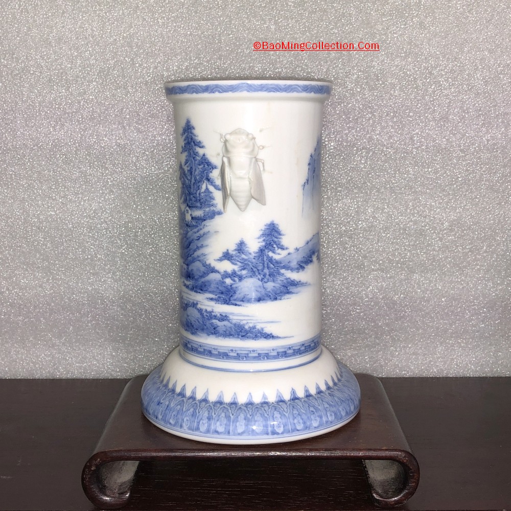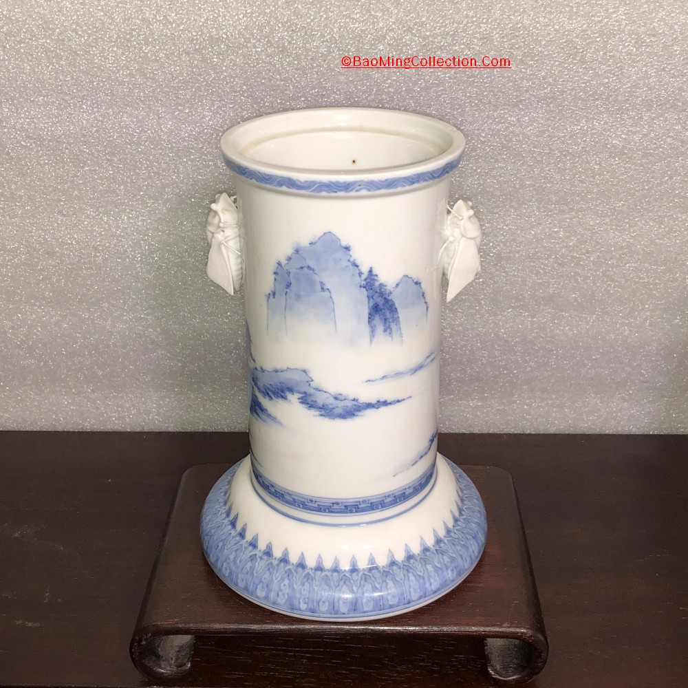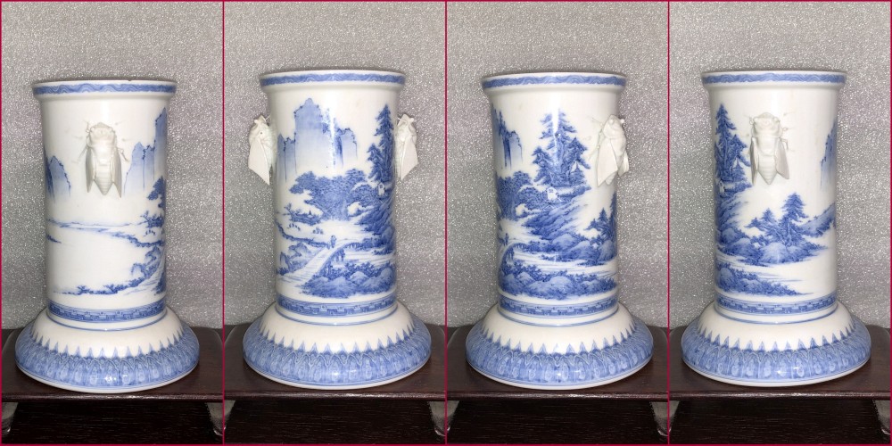 Japanese Hirado ware blue and white porcelain vase with cicada handles and landscape decoration.