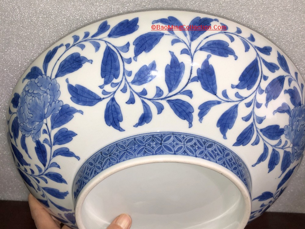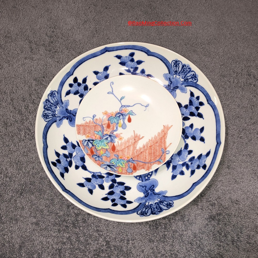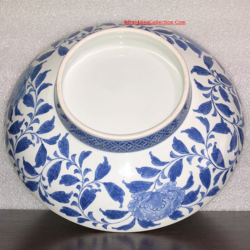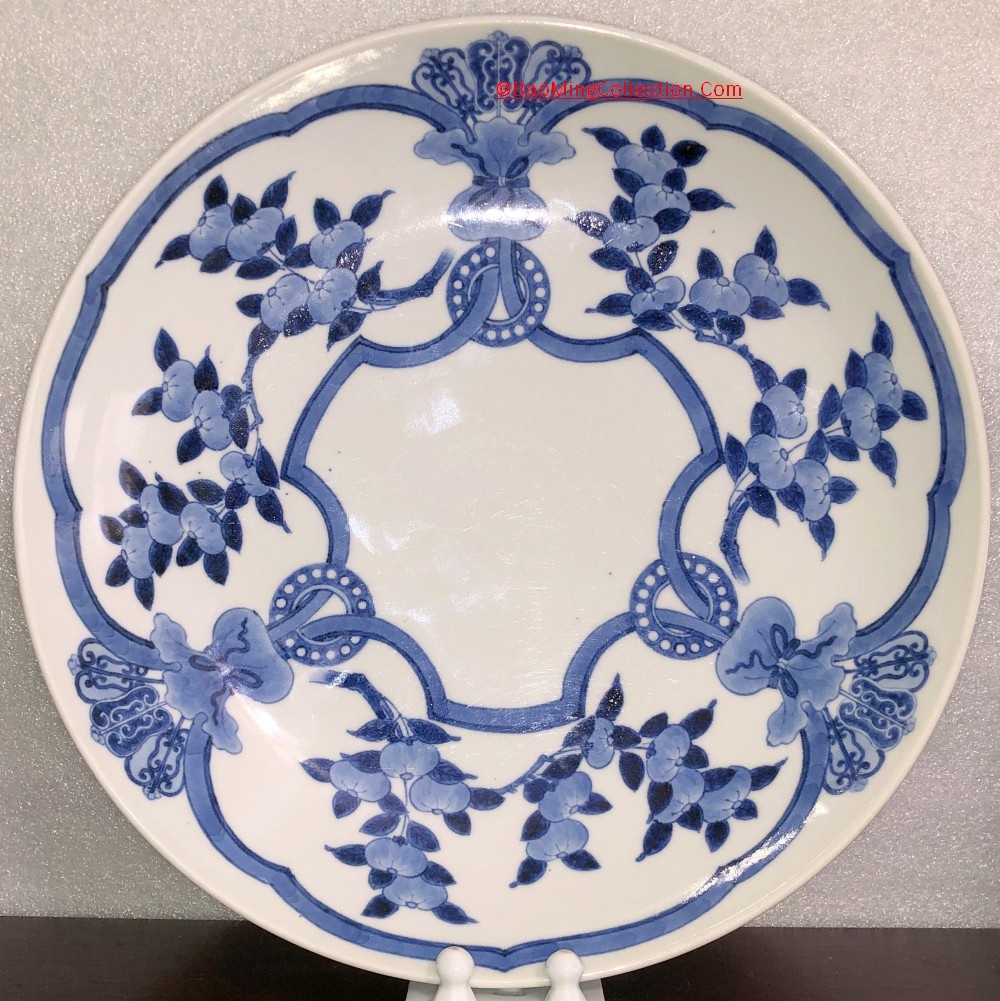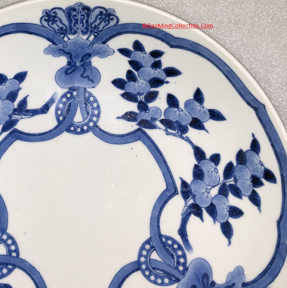 Rare Japanese Nabeshima ware blue and white porcelain Shaku-zara large dish decorated with three Ruyi-shaped reserves interlocked with each other depicting twigs of winter berry and various auspicious treasures.